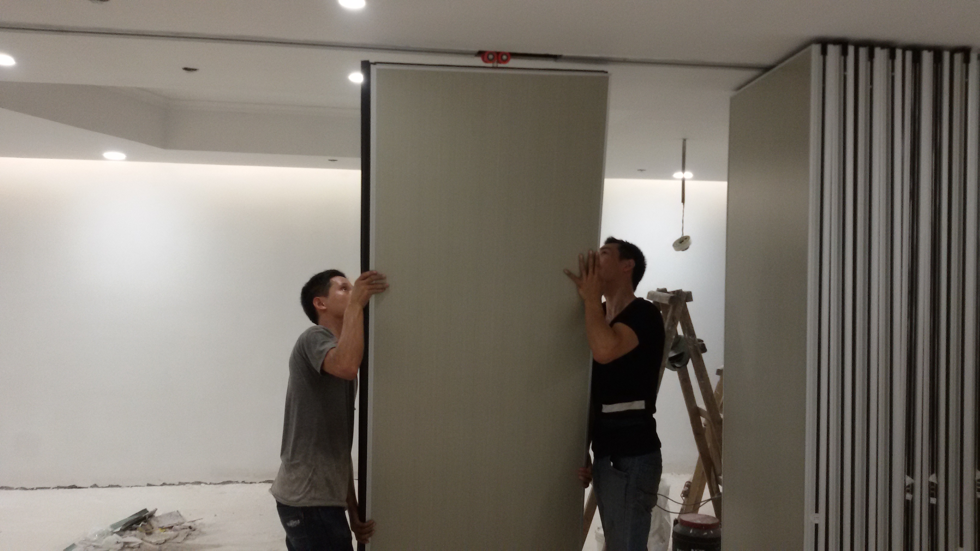 Partitions shall be top supported , manually operated panels stacked in an area nominated in the plans. When closed , the operable wall shall provide a complete sound retardant barrier . No floor track shall be used.